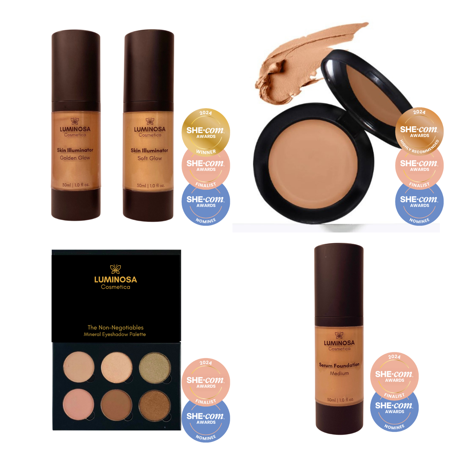 Meet our Award Winning Products for 2024! These include our Golden Glow Skin Illuminator, Cream Concealer, The Non-Negotiable Eyeshadow Palette and our iconic Serum Foundation.