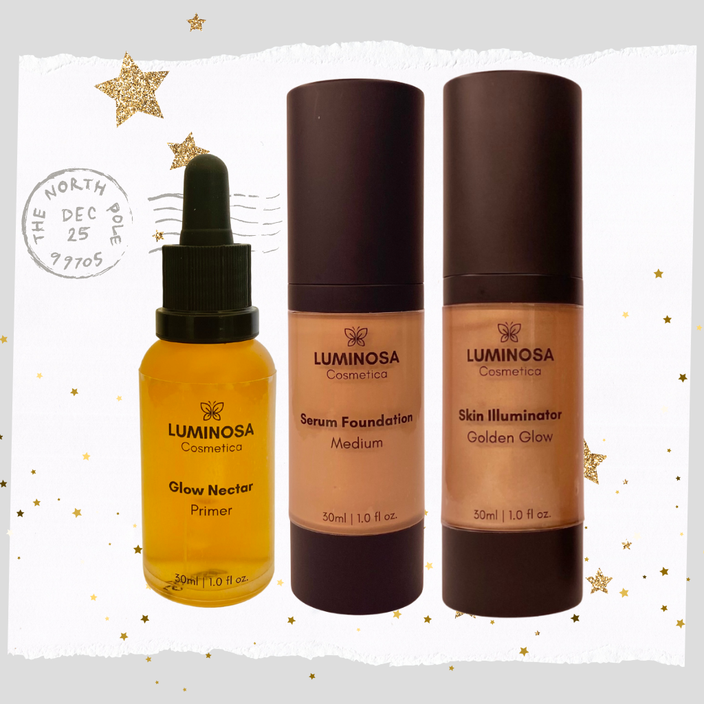 Step into the holiday season with a lit from within radiance. This trio is your shortcut to fresh, luminous skin that looks effortlessly holiday ready. Start with our hydrating Primer, add a touch of Golden Glowfor an instant glow before you finish with Serum Foundation for a smooth, flawless veil. Perfect for a backyard BBQ look or a casual catch up.